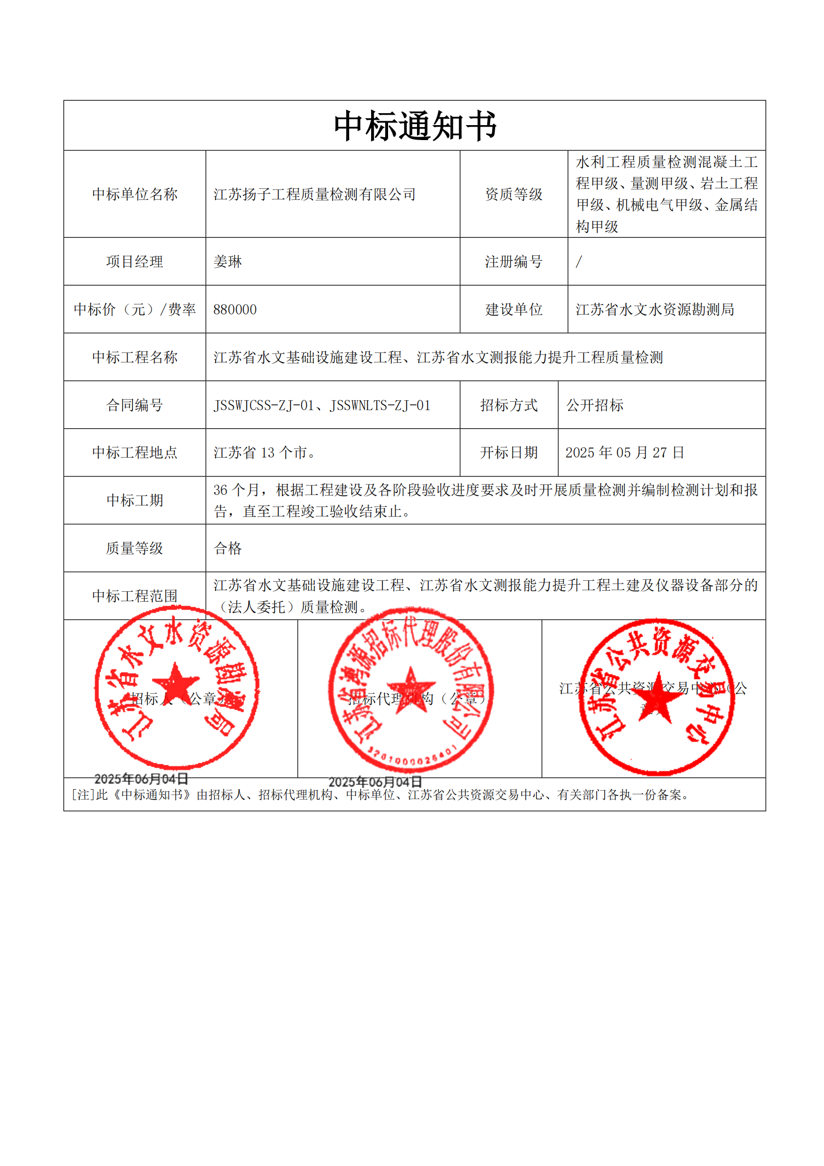 近日,江苏扬子工程质量检测有限公司首次中标水文类工程检测项目——江苏省水文基础设施建设工程、江苏省水文测报能力提升工程质量检测项目。此次中标,不仅在开拓市场业务上取得重要突破,还刷新了今年第三方检测项目单体中标额最高纪录。