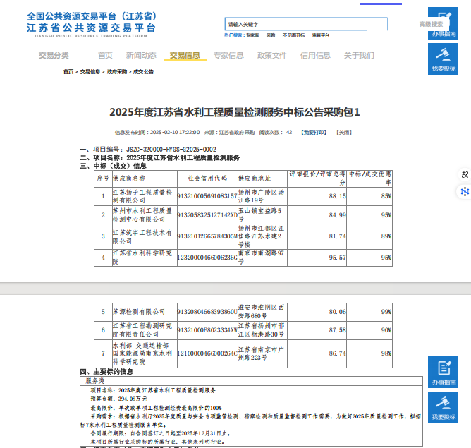 近日,江苏扬子工程质量检测有限公司中标2025年度江苏省水利工程质量检测服务项目,在10家通过资格预审的水利检测单位中脱颖而出,以评标得分第二名成功入围。 该项目将服务于全省水利工程